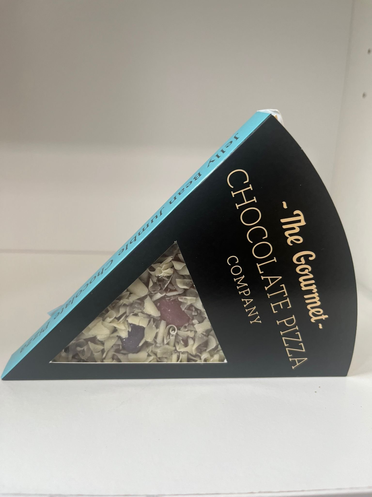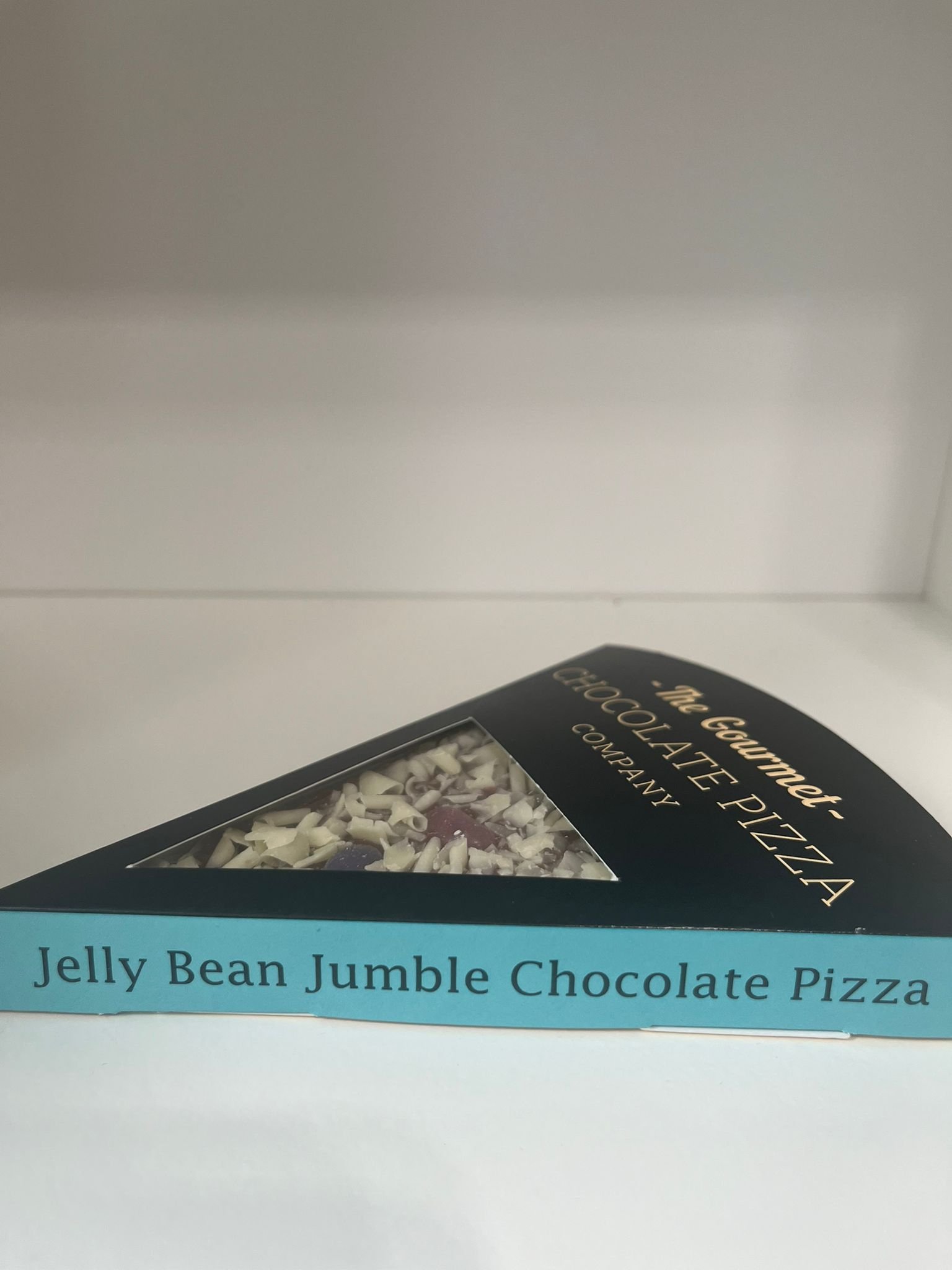 A fun and colorful treat! This Belgian milk chocolate “pizza” slice is topped with chocolate lentils, jellybeans, and finished with white chocolate curls—perfect for a playful, sweet indulgence.